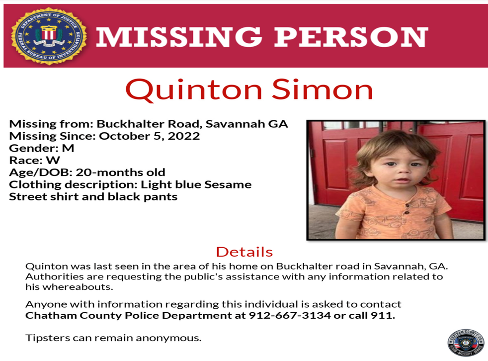 Quinton Simon 20 months old was reported missing Oct 5. At around 9 am. Quinton Simon who is only 20 months old was reported missing from his Buckhalter Road home in Savannah on Wednesday morning October 5 at approximately 9 am.